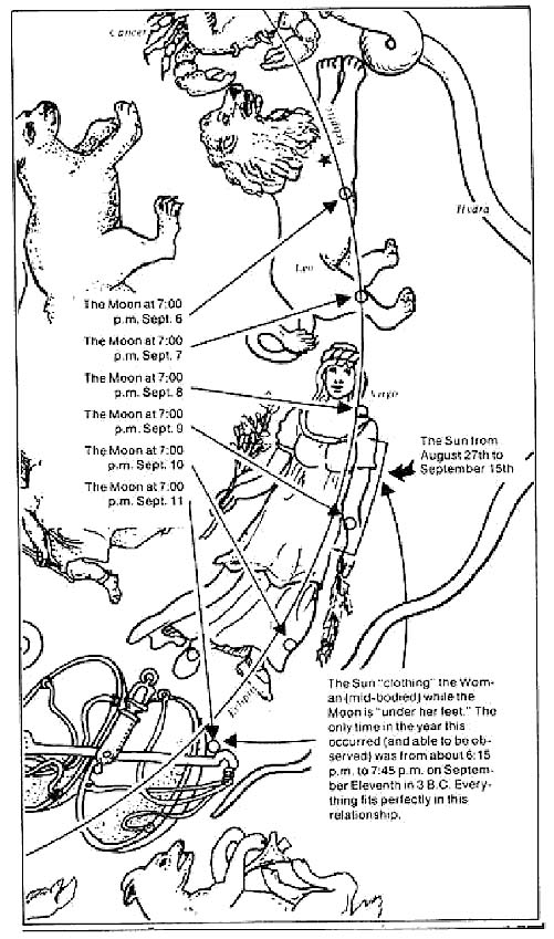 The woman in this constellation is Virgo, the sun is by her torso like it clothes her, the moon is below her feet, there are twelve stars around her head, the red dragon is actually a constellation that is positioned between her legs, and it actually looks like a red dragon, even though the verse represents SATAN attacking this woman’s offspring.